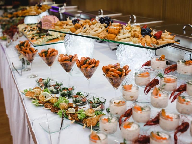 O buffet é, geralmente, o item mais caro de toda a festa e pode representar até 30% do orçamento. Os preços variam conforme o tipo de serviço (finger food, jantar à francesa, coquetel, estações gourmet) e a quantidade de convidados.
